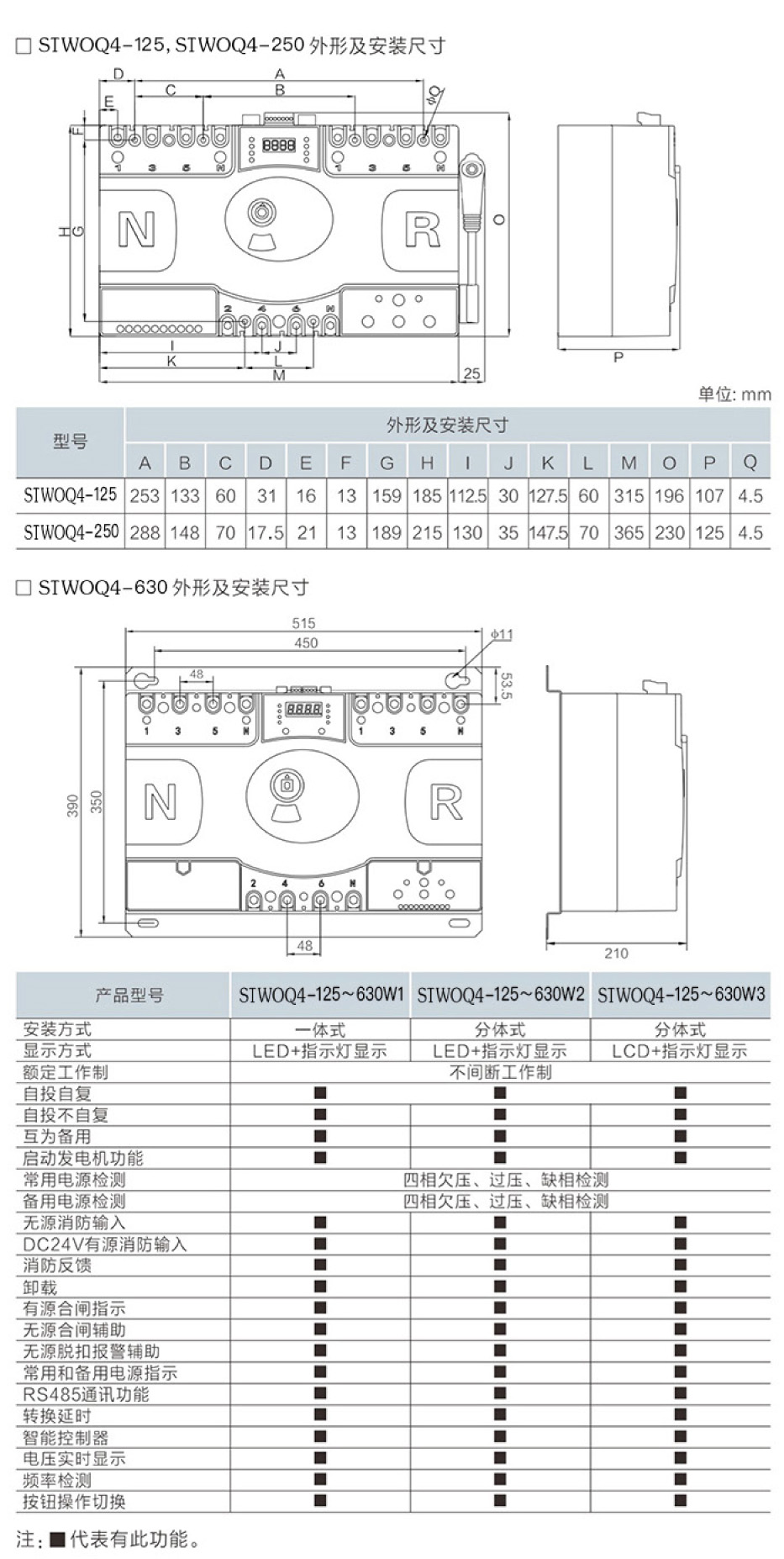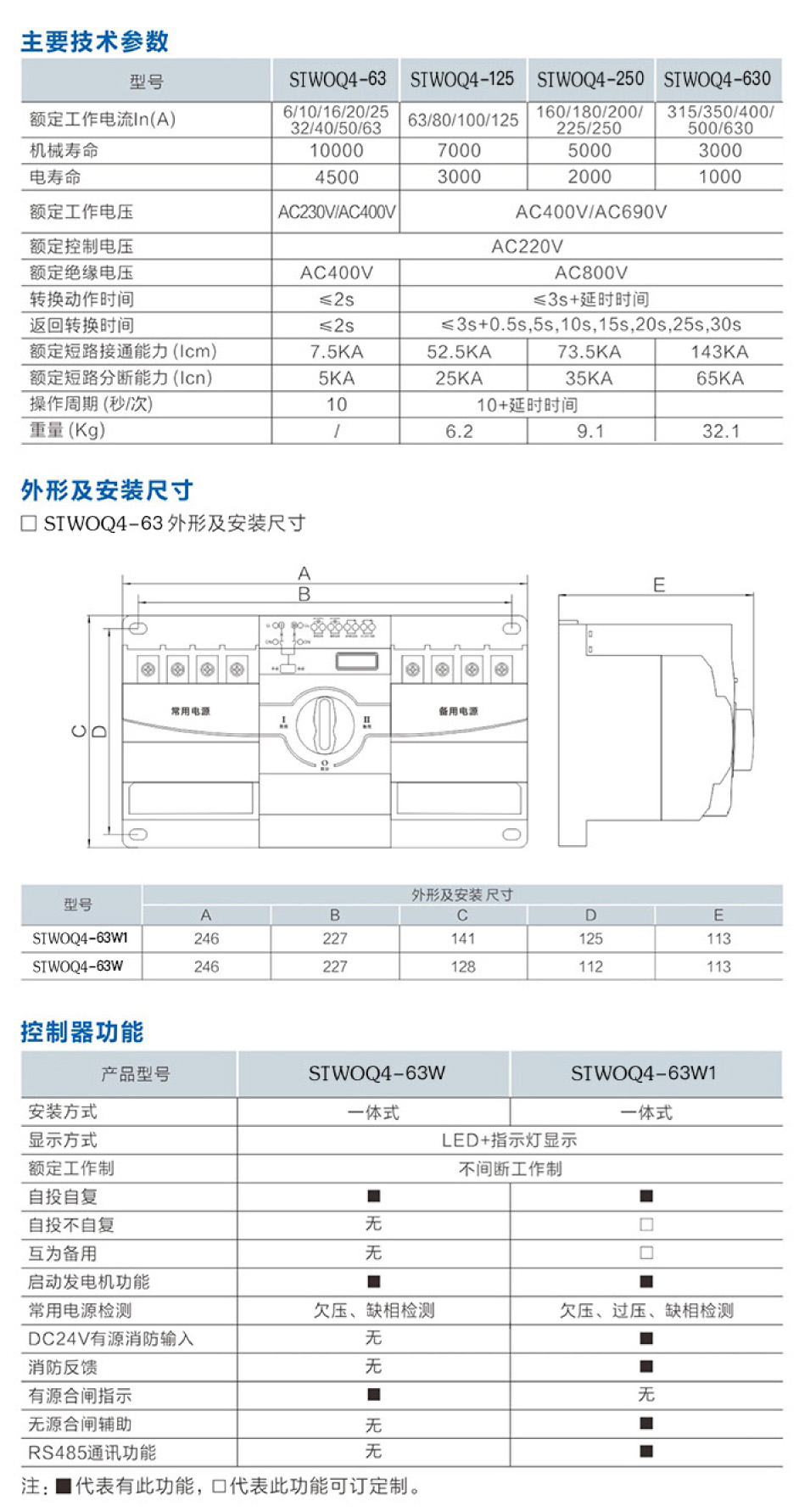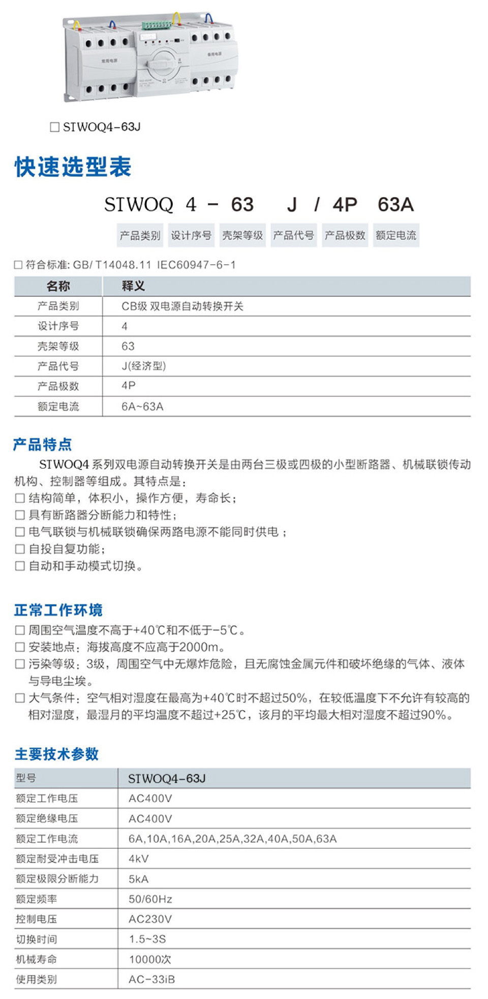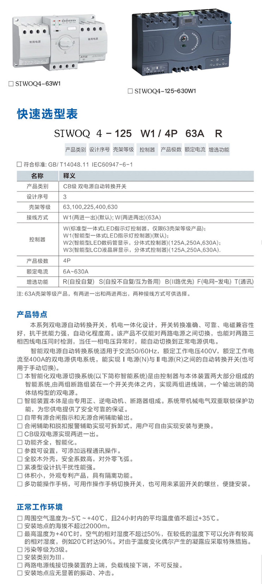 具有斷路器分?jǐn)嗄芰吞匦?電氣聯(lián)鎖與機(jī)械聯(lián)鎖確保兩路電源不能同時(shí)供電;自投自復(fù)功能;自動(dòng)和手動(dòng)模式切換。">
