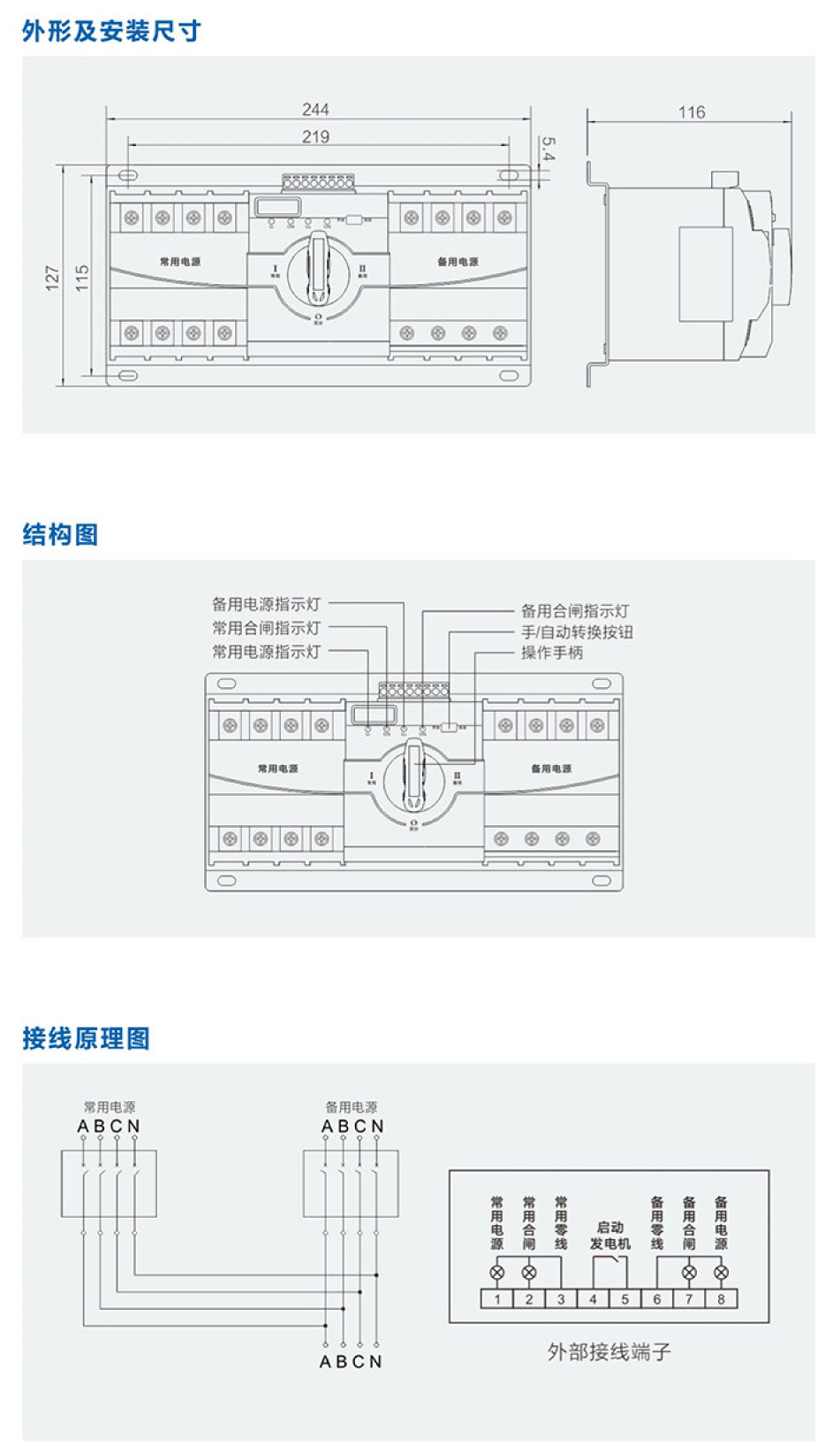 結(jié)構(gòu)簡單,體積小,操作方便,壽命長;具有斷路器分?jǐn)嗄芰吞匦?電氣聯(lián)鎖與機(jī)械聯(lián)鎖確保兩路電源不能同時(shí)供電;自投自復(fù)功能;自動(dòng)和手動(dòng)模式切換。